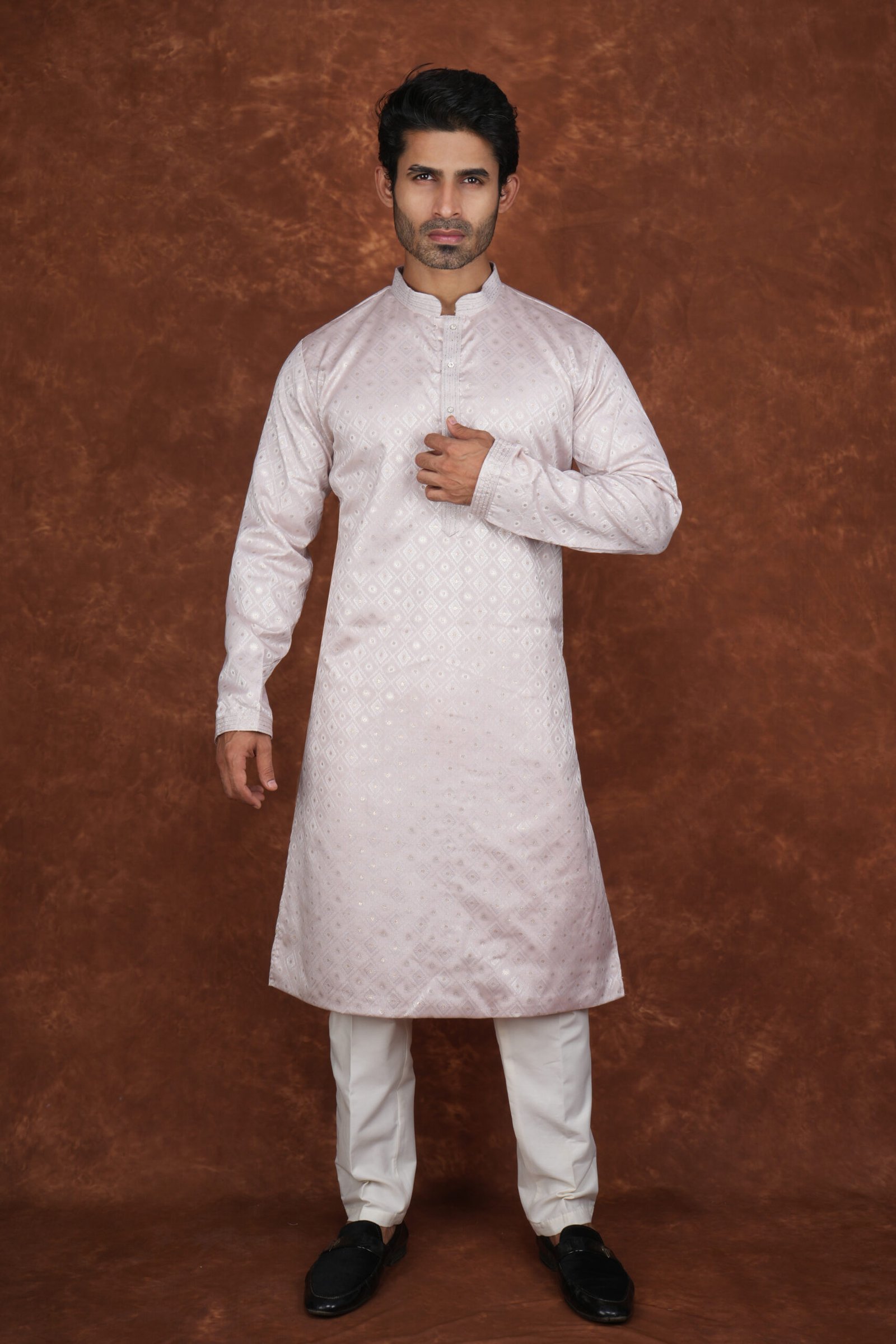 Men wearing classic diamond jacquard kurta in soft pink with mandarin collar for wedding and festive wearClassic Diamond Jacquard Kurta
