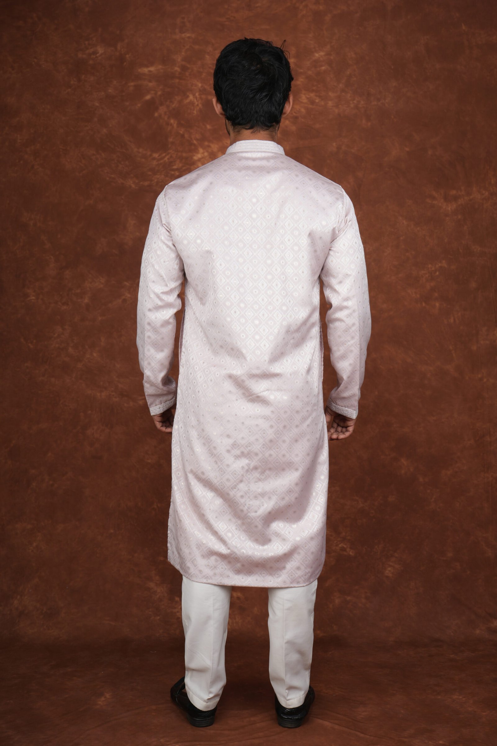 A timeless jacquard kurta featuring a subtle diamond weave, designed in elegant pastel tones. Ideal for festive occasions, wedding functions, and refined ethnic celebrations.