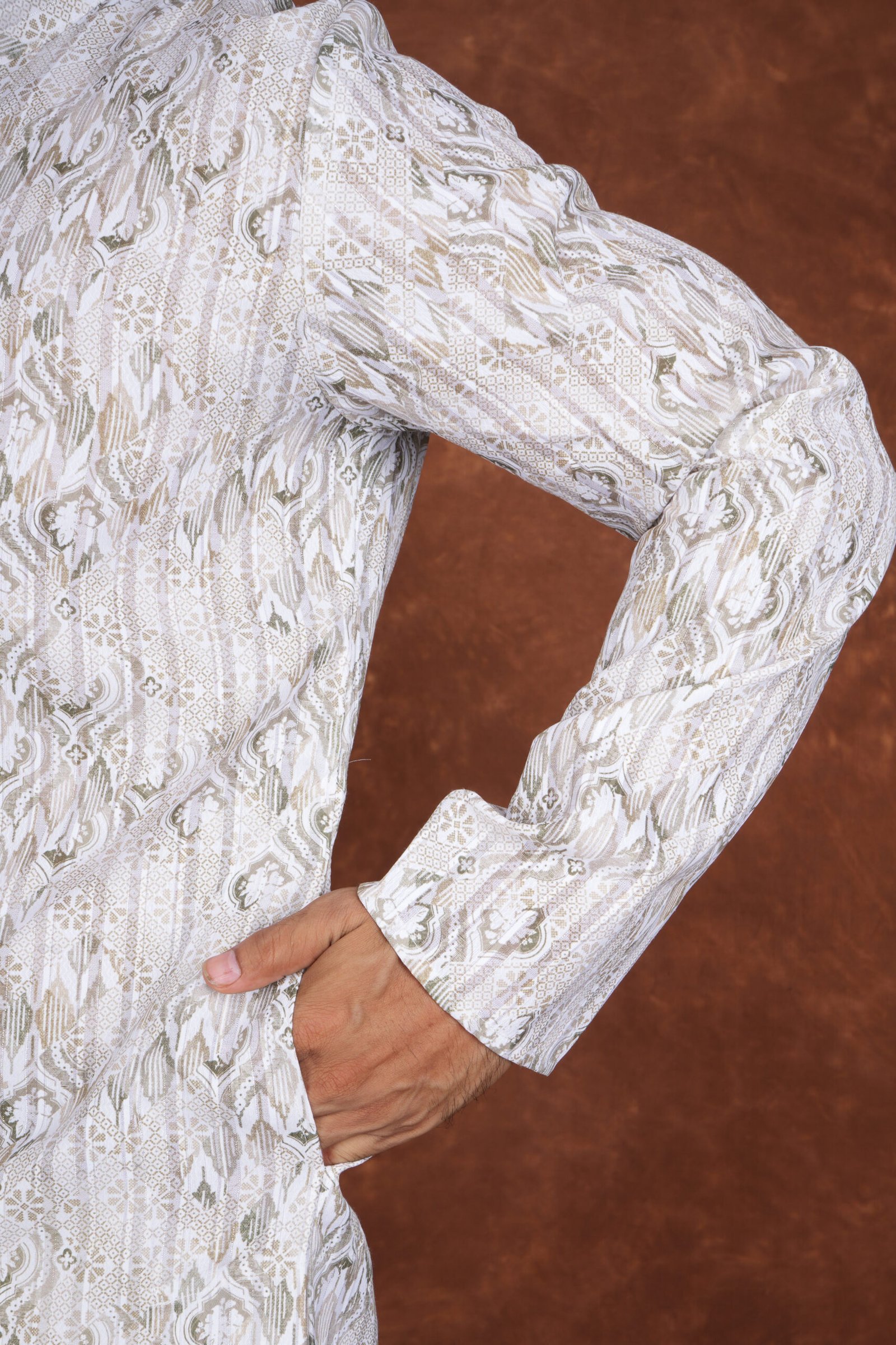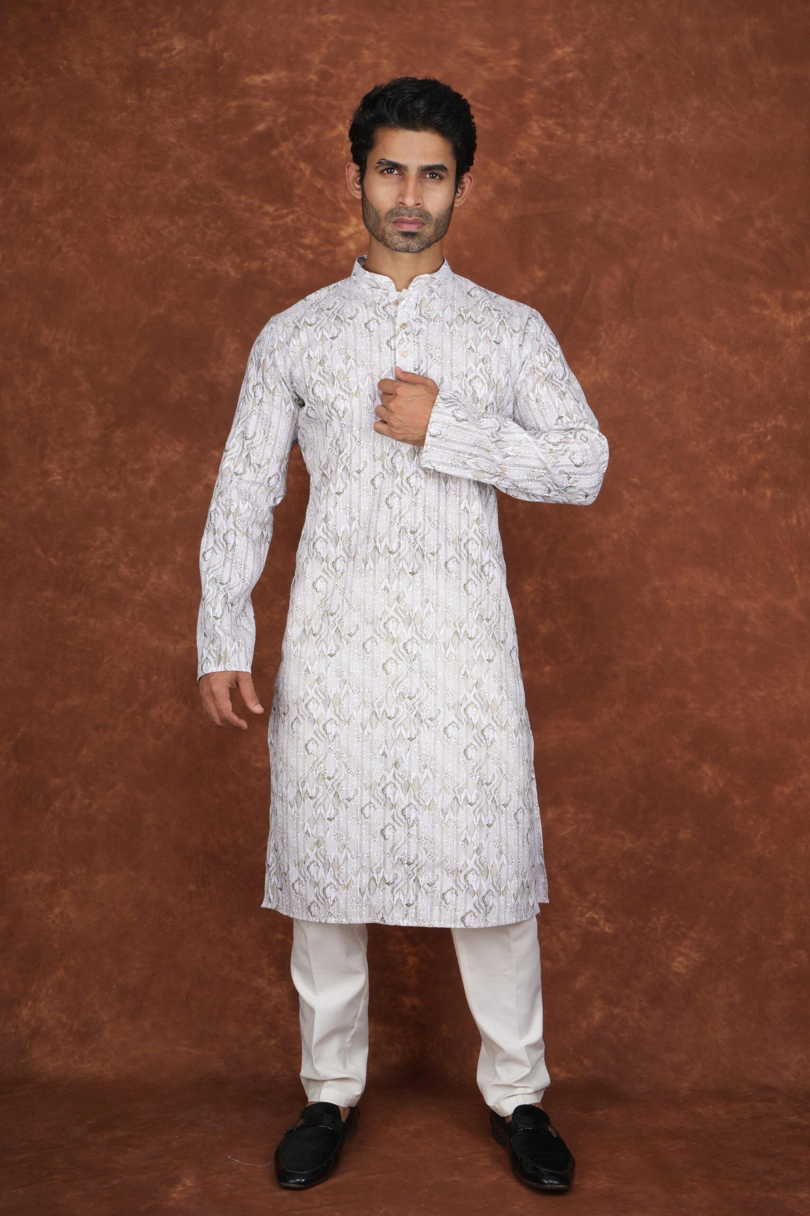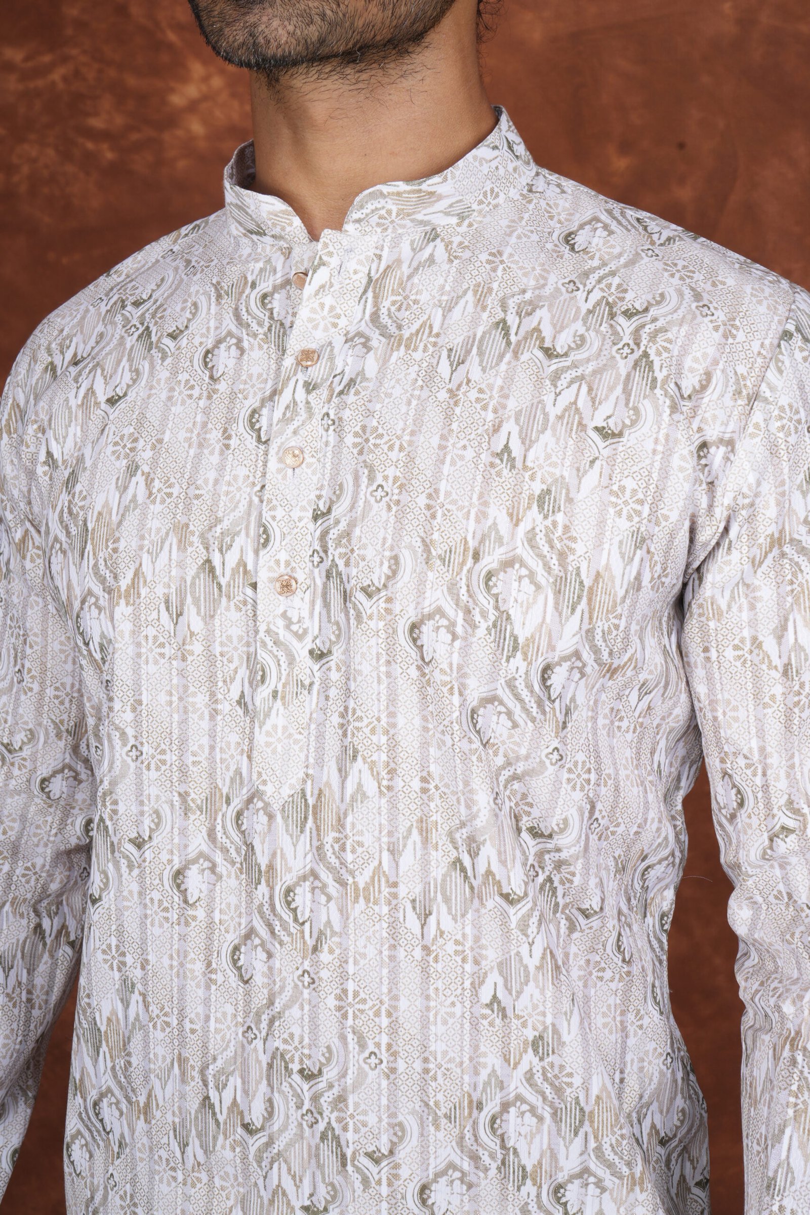 A refined jacquard kurta featuring intricate woven patterns and a mandarin collar. Perfect for weddings, festive occasions, and traditional celebrations.