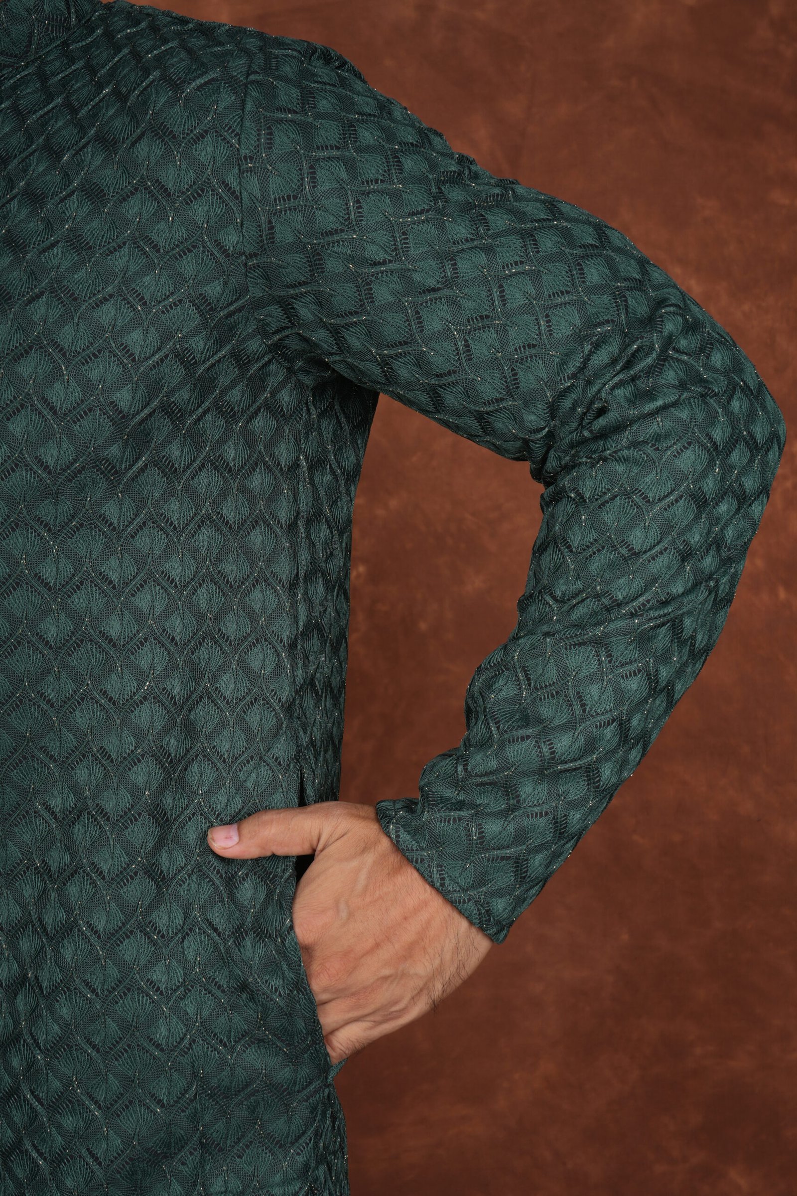 This textured jacquard kurta set is designed for men who prefer understated sophistication blended with traditional craftsmanship. The kurta features an all-over woven pattern that adds depth and character while maintaining a clean, refined ethnic look suitable for both festive and formal occasions.