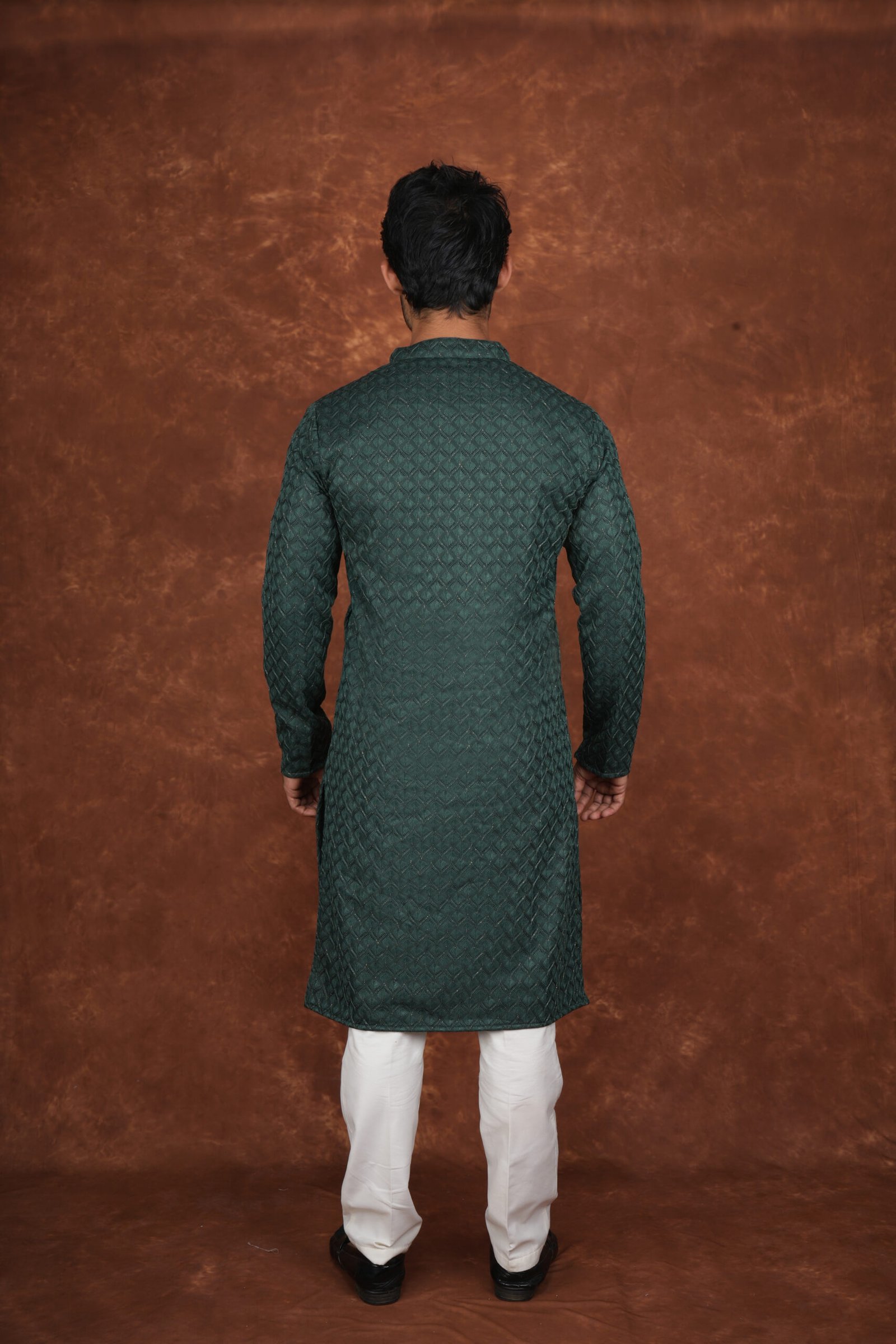 Tailored with a classic band collar and a neat front button placket, the kurta offers a structured yet comfortable silhouette. The full-length sleeves and straight-cut profile ensure ease of movement and a flattering fit, making it ideal for long celebrations and cultural gatherings.